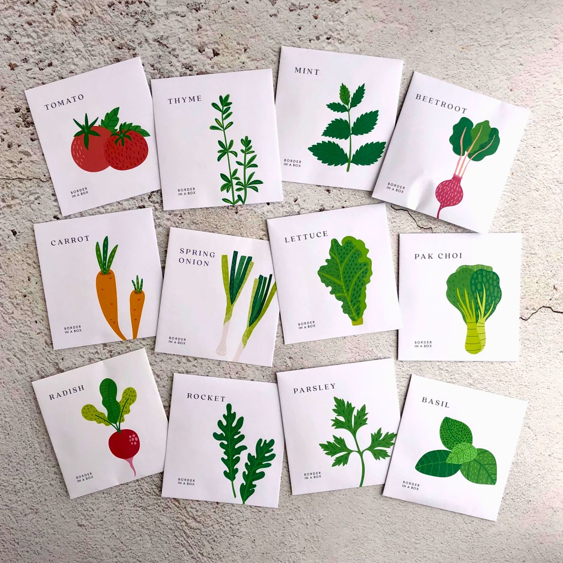 - 12 packets of seeds (full size, with one to sow each month) - Carrot, Tomato, Lettuce, Pak Choi, Radish, Parsley, Mint, Basil, Thyme, Rocket, Beetroot, Spring Onion (all seed supplied by Mr Fothergills in foil sachets)