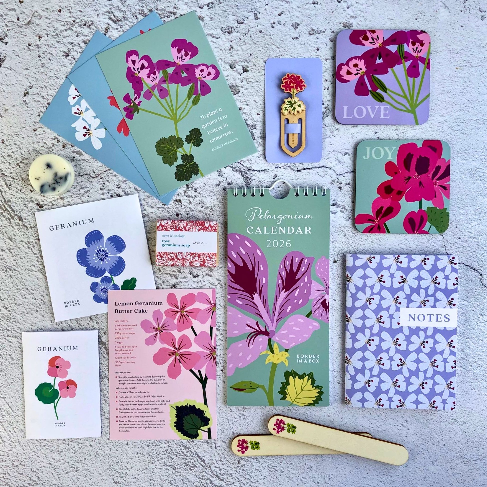 Geranium seeds, DL calendar, notecards, soap, wax melt, plant labels, bookmark, notebook, seed starter kit, coasters (2 designs), and a pelargonium cake recipe card. (Contents may vary slightly due to availability, but each item will be thoughtfully chosen and of equal or greater value.)